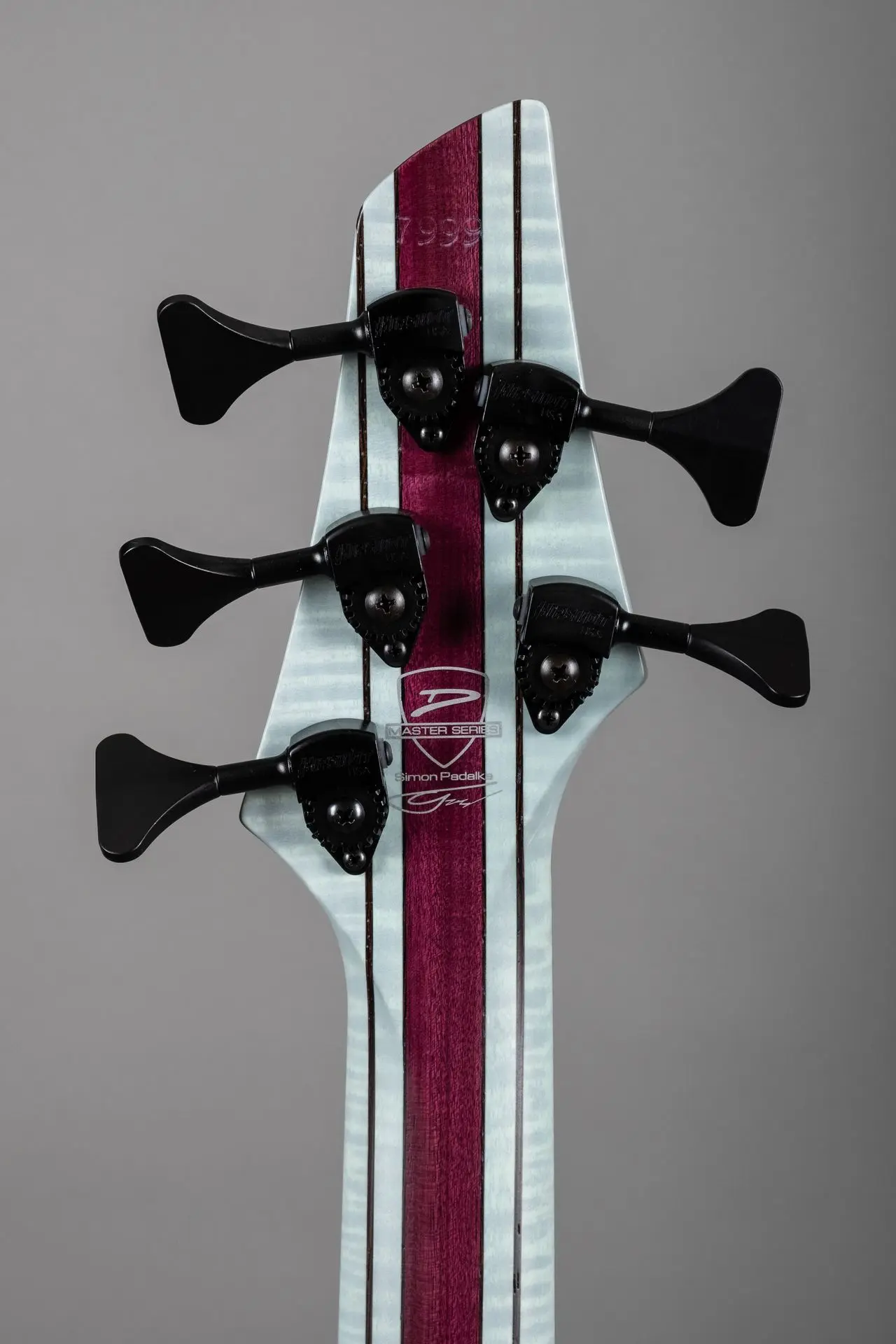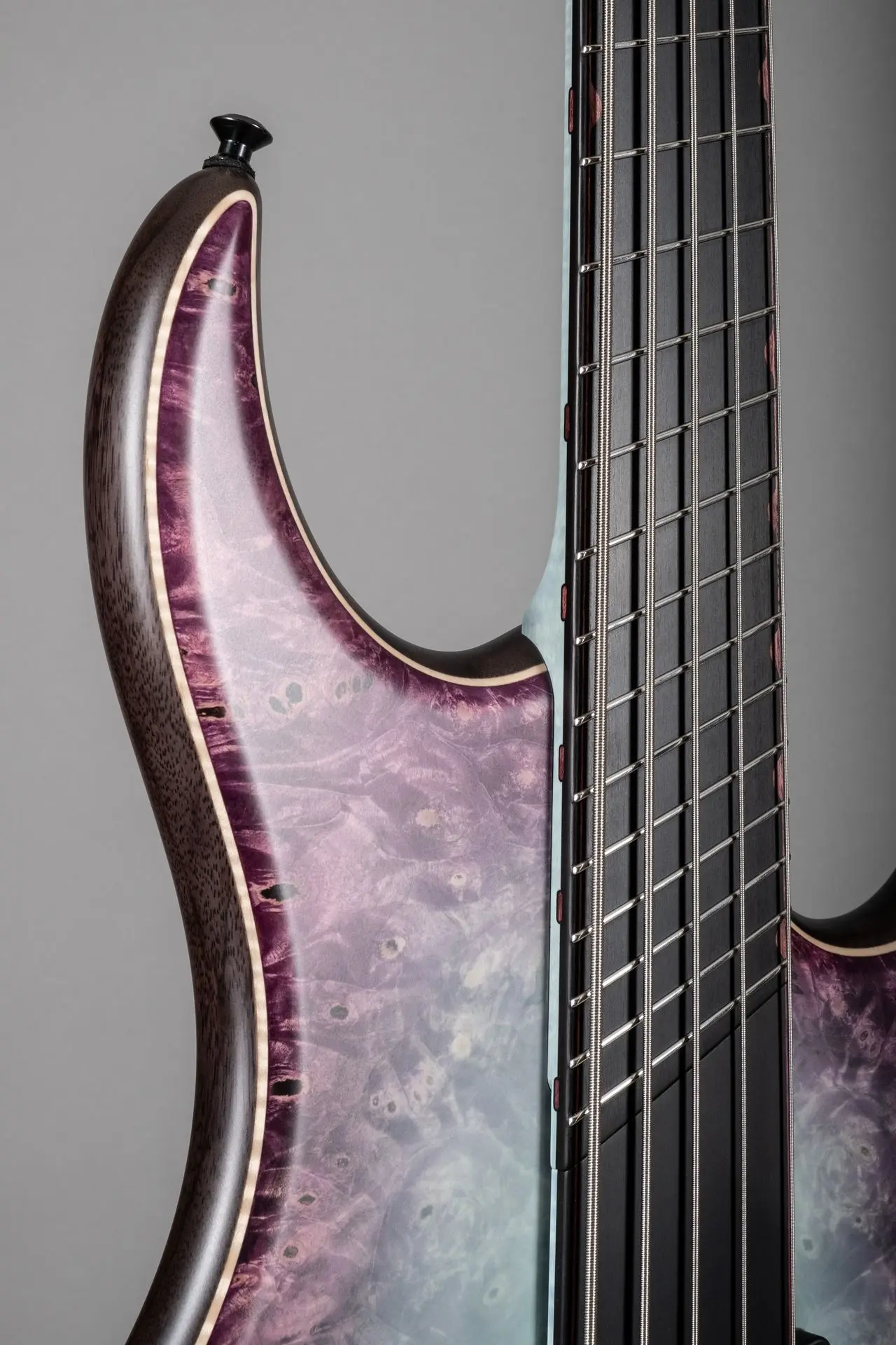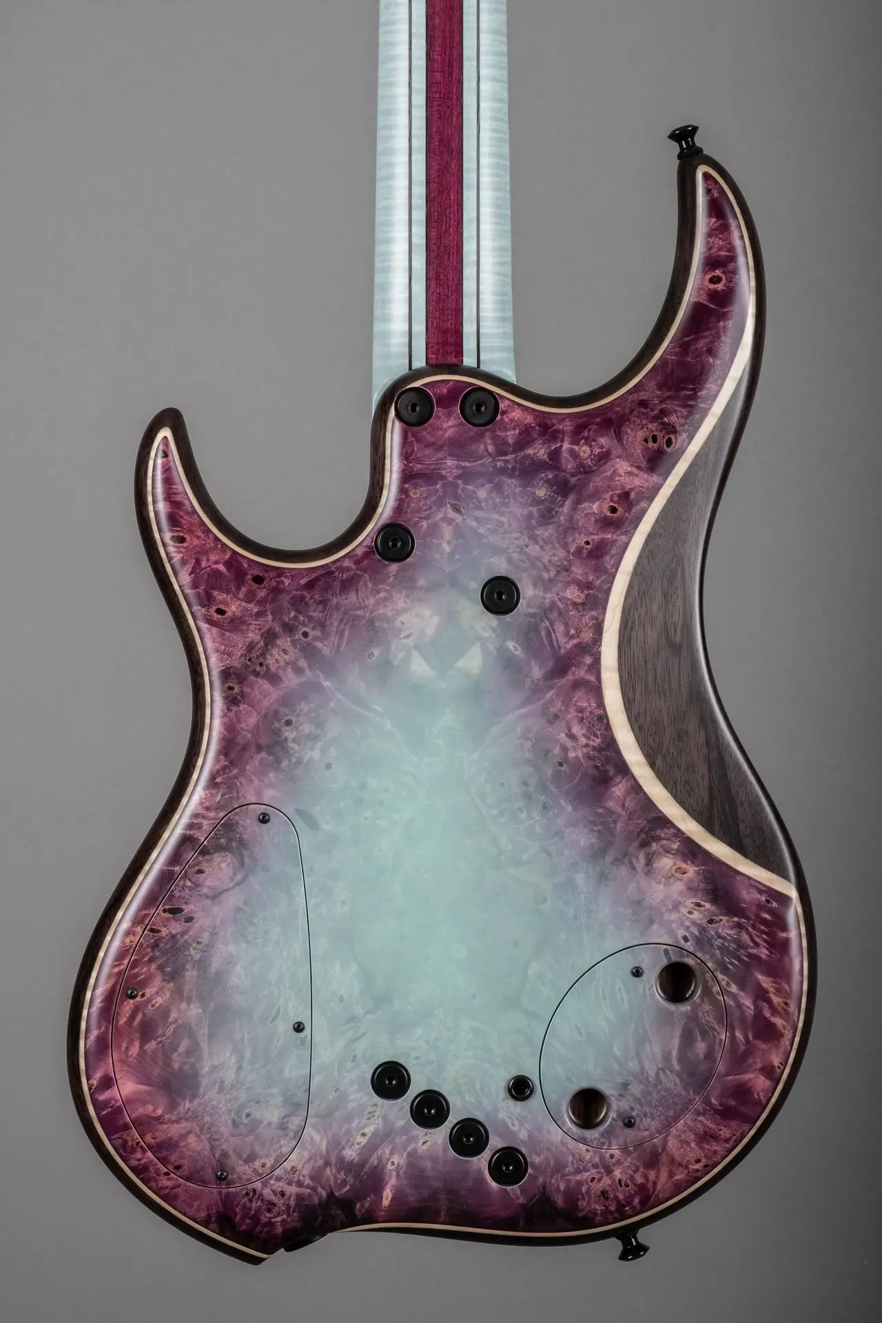 Specs: five-string, swamp ash body, black flame maple contrast layers, maple top and back, two-piece flame maple neck with black stain, flame maple fretboard, Holographic Silver finish, PA5 pickups (black flame maple shells), Glockenklang electronics with toggles, custom aluminum fretboard inlays and side dots, matching headstock, black hardware, DR strings.