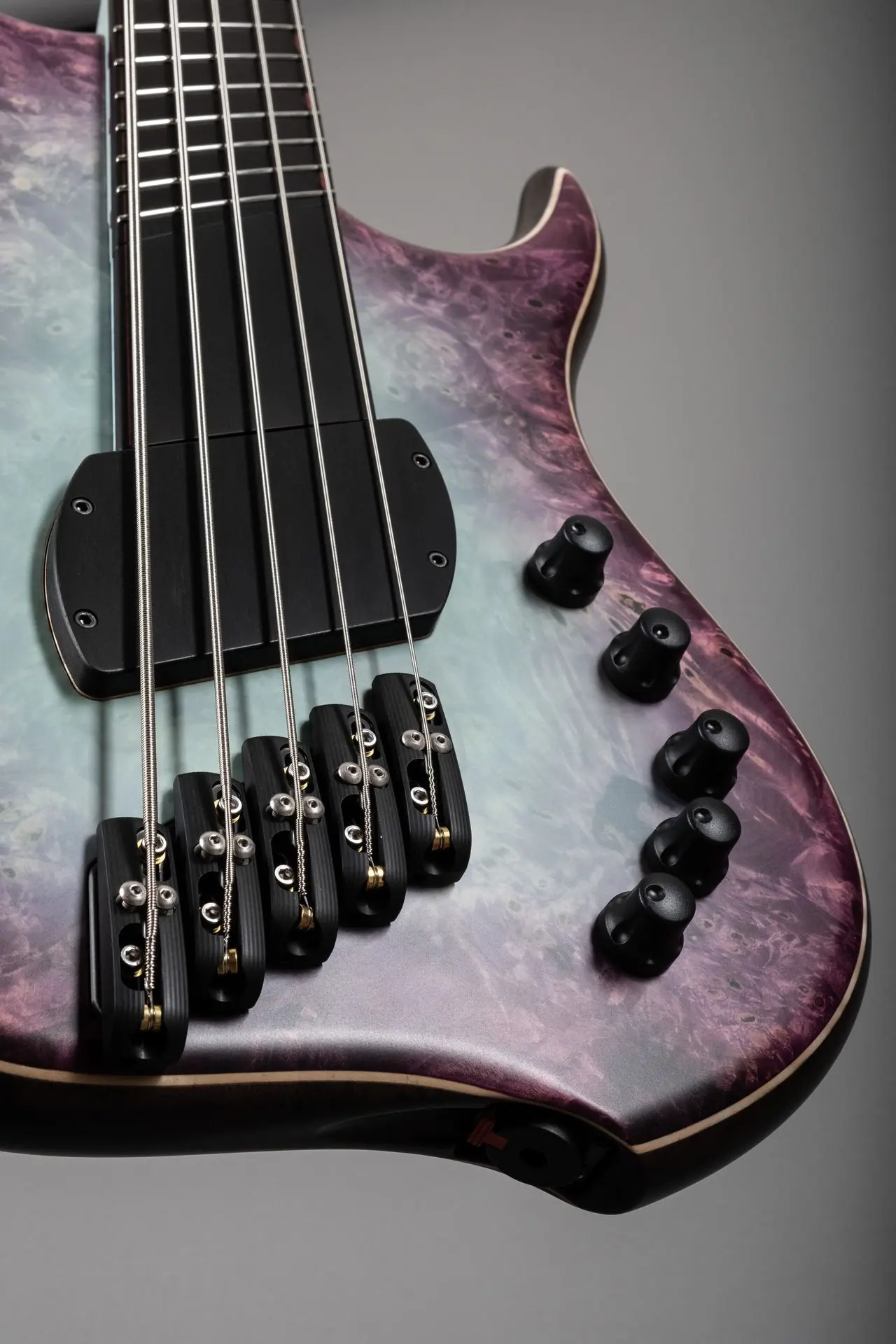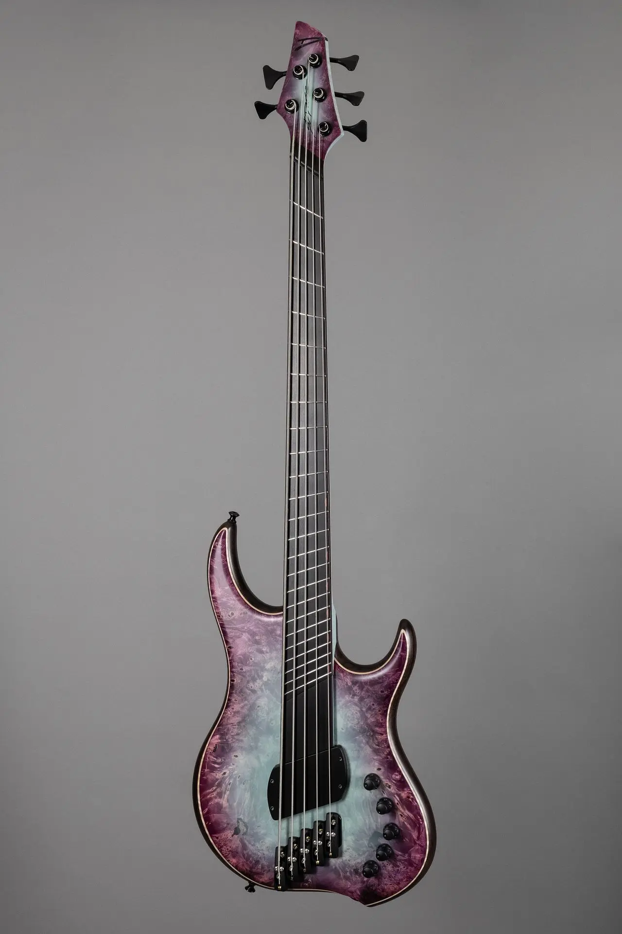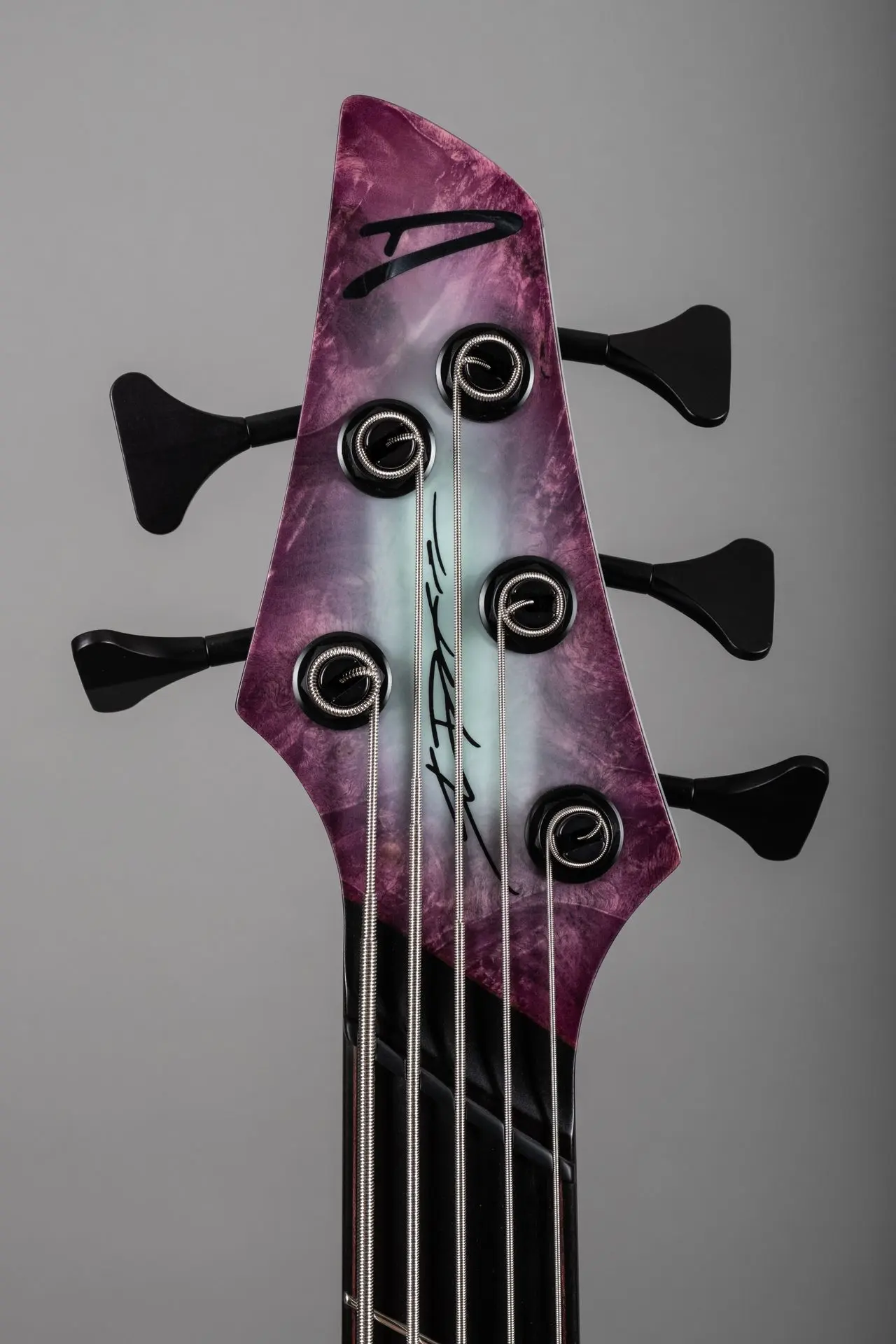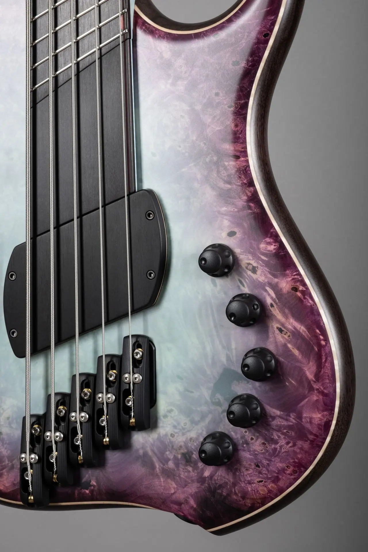 Specs: five-string, swamp ash body, black flame maple contrast layers, maple top and back, two-piece flame maple neck with black stain, flame maple fretboard, Holographic Silver finish, PA5 pickups (black flame maple shells), Glockenklang electronics with toggles, custom aluminum fretboard inlays and side dots, matching headstock, black hardware, DR strings.
